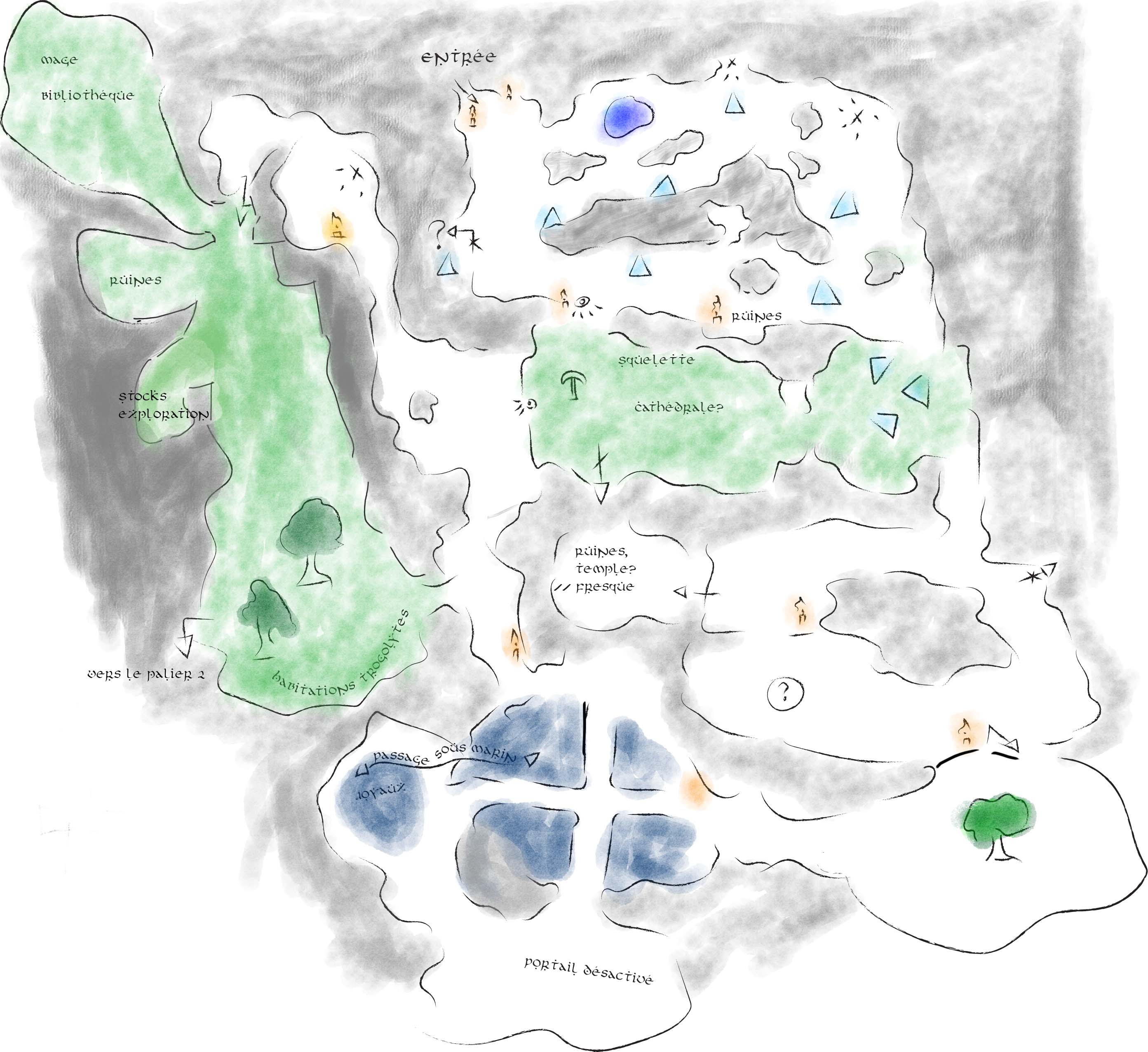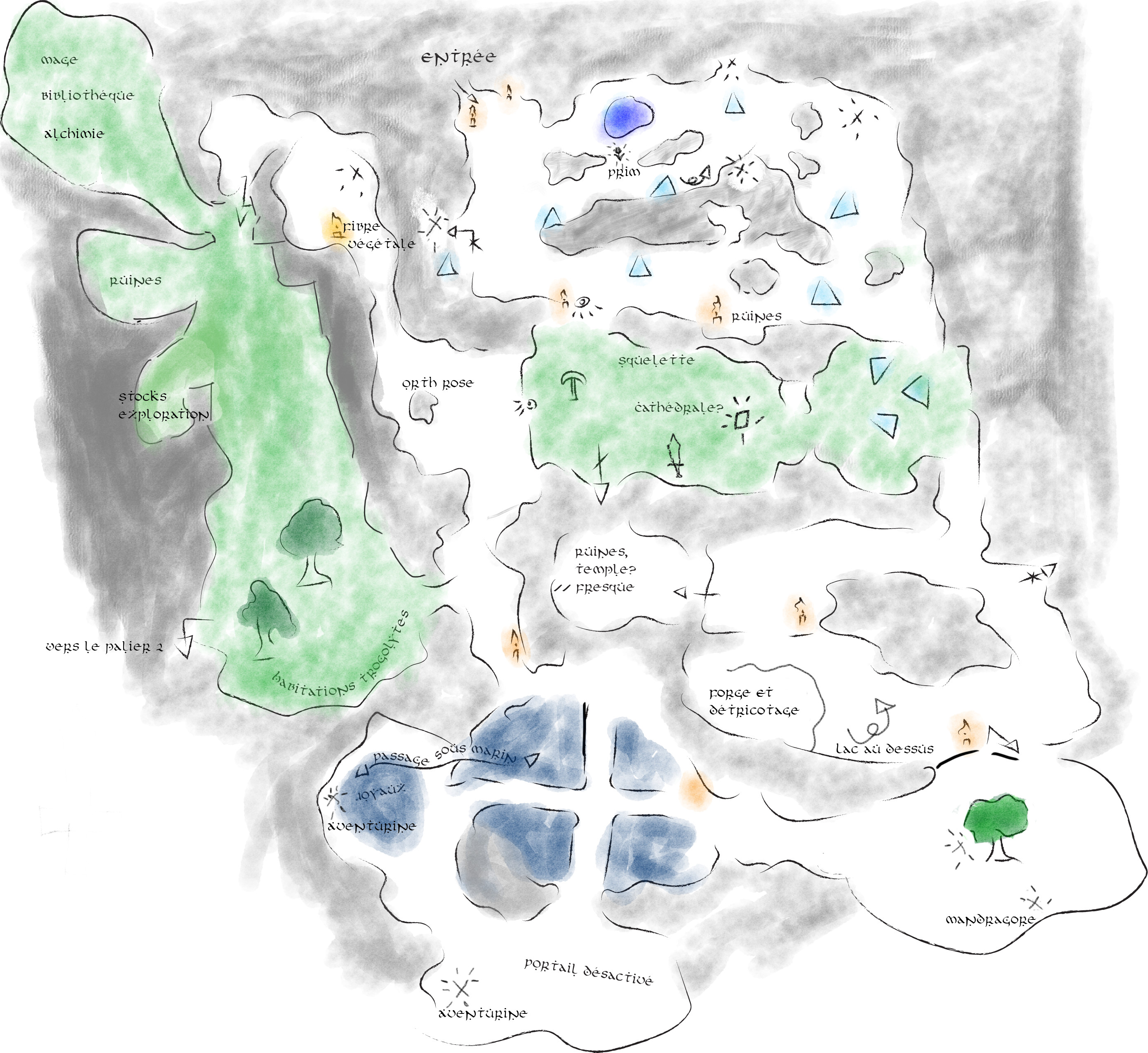 Carte dessinée par Hésyle Crowley (Ruvac) du premier palier des Tréfonds.