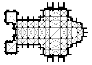 Sa nef à bas-côtés, composée de 6 travées, s'ouvre sur un transept débordant de 3 travées à collatéraux et un chœur.