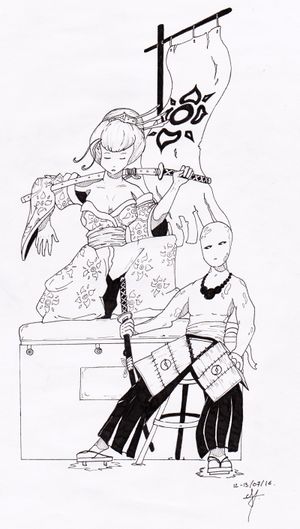 Son dur labeur culmina lors d’un dernier engagement où les deux sœurs réalisèrent que trop tard qu’elles étaient les seuls à partir à l’assaut, et elles furent capturées par leur camps respectifs, ligotée, et forcées à dialoguer. Les informant du décès de leur père, Kusadoro réussi à forcer les sœurs à partir ensemble en pèlerinage pour aller recueillir la tombe de leur père, pendant qu’il organisa la troupe qu’il avait jusqu’à présent dirigé vers la paix à former une nouvelle ville. C’est ainsi dans les festivités que naquis Akuma Kyōdai[7].