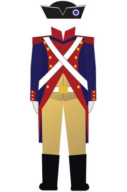 L'habit-veste est de couleur "bleu nuit", le plastron est rouge à boutons dorés, les retroussis et emmanchures sont également rouges.