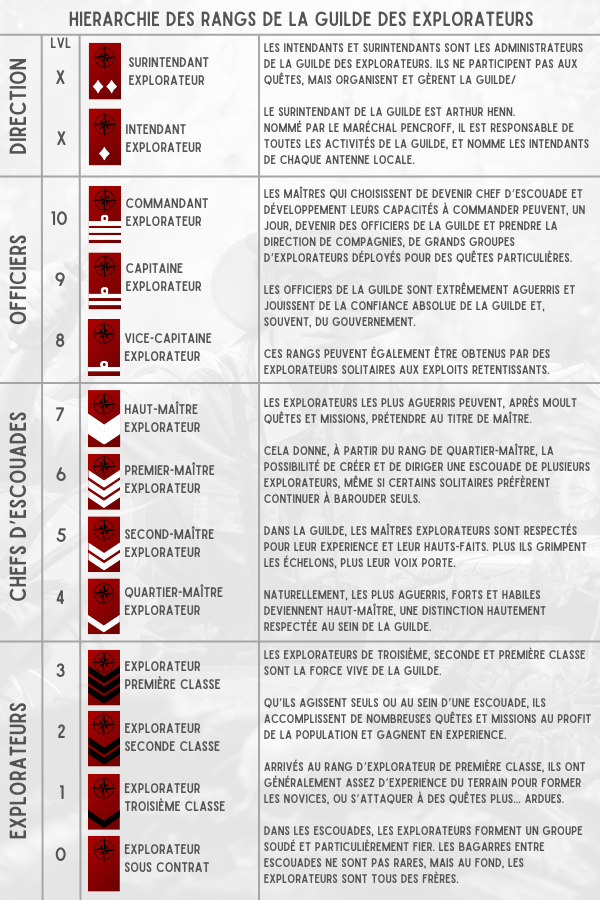 Les | Les rangs de la guilde marquent la progression de l'explorateur parmi ses pairs et lui permet d'accéder à des avantages en fonction de son rang.<br> | ||