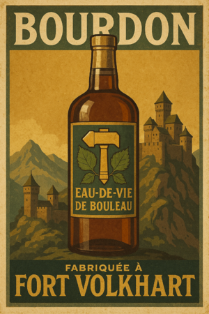 Outre la production officielle strictement encadrée par les autorités du fort, une production clandestine de Bourdon circule également, souvent issue d’alambics illégaux dissimulés dans les sous sols du Fort Volkhart. Cette version de contrebande, plus instable et parfois frelatée, est réputée dangereuse à la consommation, bien qu’elle continue de circuler dans les milieux marginaux, notament de la pègre, à destination de contrés lointaines. | |||