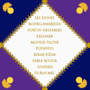 - Les couleurs de l'étendard de la garde, bleu blanc et violet, sont le symbole de l'armée (bleu), de la paix (blanc) et de l'empire de stendel (violet).